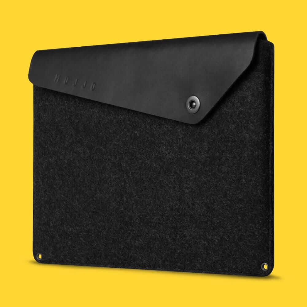 This minimalist computer cover features vegetable-tanned leather, water-repellent felt and integrated storage on the side.