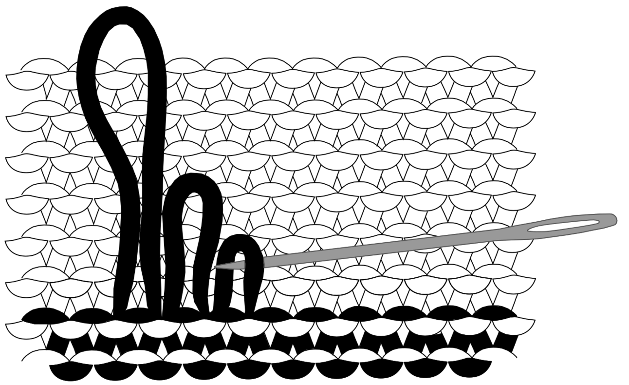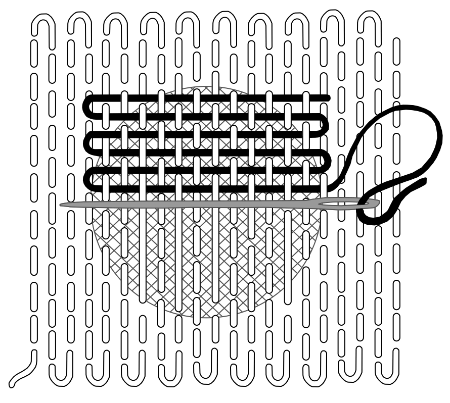 3) Repeat the process, now stitching horizontally, weaving your thread over and under the vertical thread lines. This is what recreates the knit's original weave. Finish by pushing the needle inside the garment, tie off the thread, and snip it.