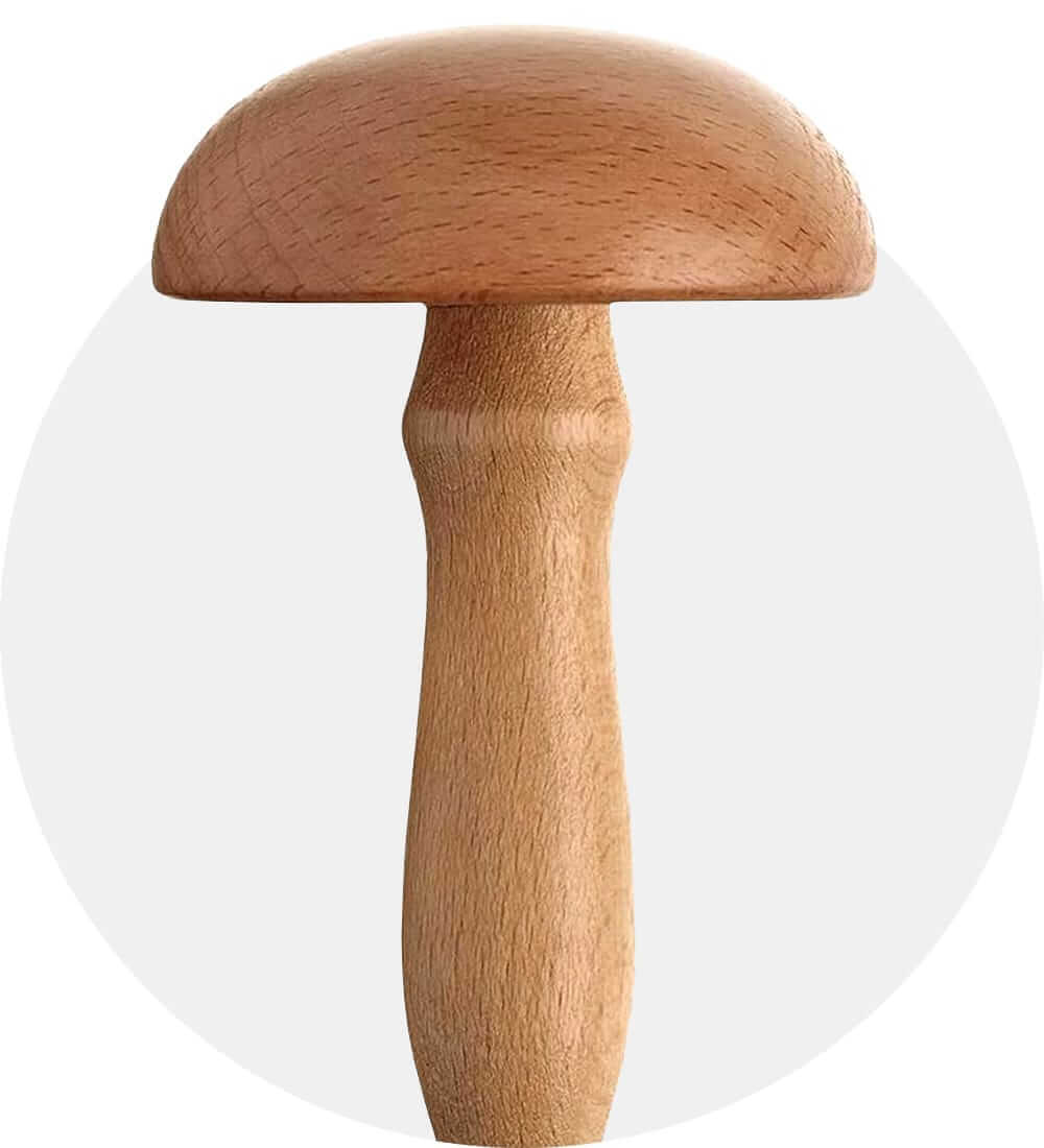 1) Situate the hole snugly over a wooden darning mushroom to support the fabric, but don't stretch it too tightly. This helps you create a stabilized work surface.