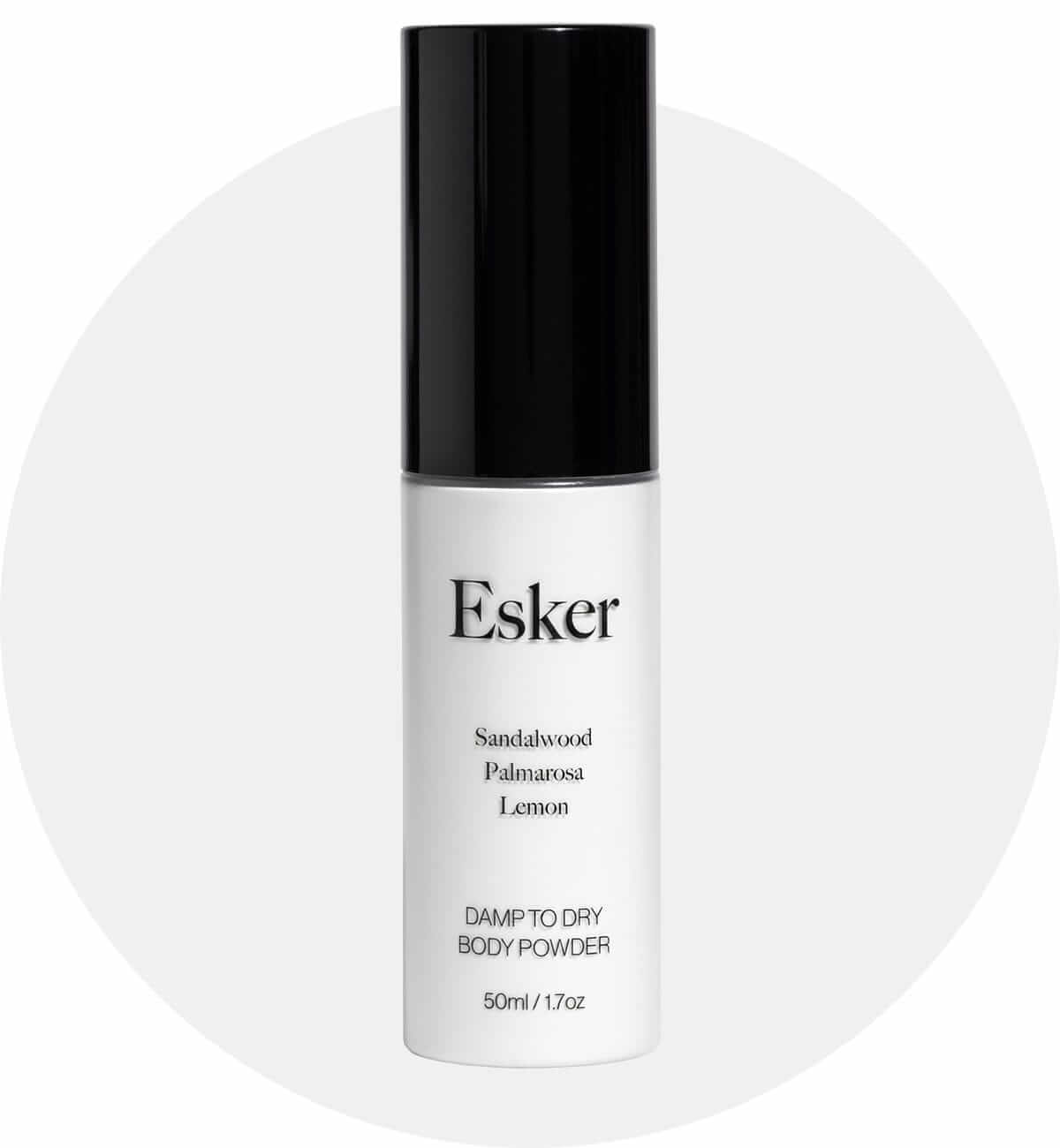 For Irritated Skin Soothe red, itchy and irritated skin while keeping it dry with this powder pump bottle. The highly absorptive formula is crafted from a blend of organic arrowroot powder, rice powder, silica and detoxifying kaolin clay. It features powerful botanicals including sandalwood and lemon, which carry anti-bacterial, anti-microbial and anti-fungal properties. Damp to Dry body powder, $35 by Esker |
