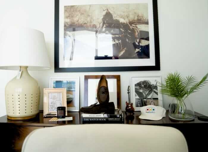 Family photos, vintage ceramic Bellini box, classic Bic Cristal Xtr pens, TOM FORD candle, Soho Home coffee mug, Ricoh GR-III camera and various lenses, design books and brand samples, and Milano loafer prototype |